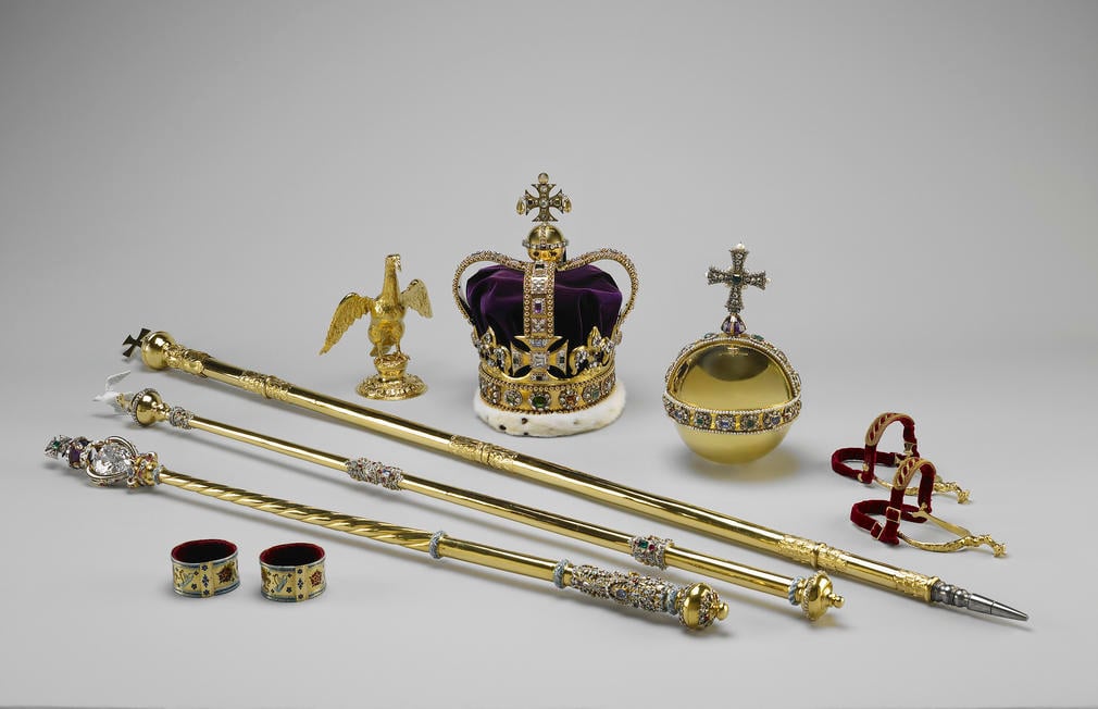 The Crown Jewels are not simply the crown that the monarch wears, or the scepter, or the orb. No, there are many other things that make up this selection of precious things, a group of items called, “a unique collection of sacred and ceremonial objects.” Over 100 items, in fact. 23,000 gemstones adorn the various items. We can’t really put a price or value on these things simply because of their intrinsic and symbolic value to the people of the United Kingdom. They mostly either represent the power and responsibilities of the role of monarch or they are used in the coronations.
