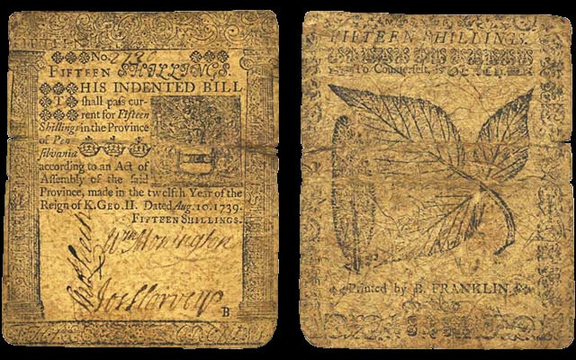 All of these processes made the Pennsylvania pound notes the envy of the colonies. It helped stabilize the economy of the colony at the outset of the American Revolution. The British tried to ruin the American economy by producing fake bank notes during the war, and they succeeded in doing major harm to many of the other colonies, but not so much in Pennsylvania. Because the other colonies’ currencies were easily faked, the fledgling United States distrusted paper money until the era of the Civil War, more than 80 years later, relying instead on coinage.